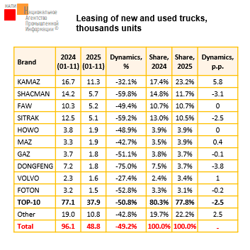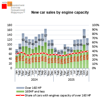 The marketing agency NAPI analyzed the dynamics of new car sales by engine capacity. In Jan-Nov 2025, 1,171.6 thousand new cars were sold, which was a 16.9% decline on the similar period of 2024. Of them, 406.6 thousand units with engines capacity of over 160 HP (-14.4% on 2024) and 765 thousand units with engines capacity of 160 HP or less (-18.1%) were sold.