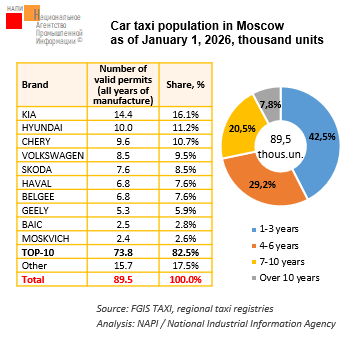 According to the marketing agency NAPI, as of January 1, 2026, the Moscow taxi population numbers 89.5 thousand cars with valid permits.