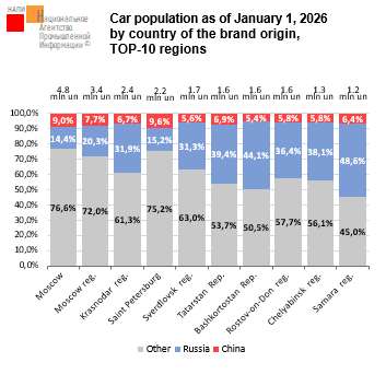 TOP-10 regions account for 41.1% of the car population. The share of Russian cars in the list of TOP-10 regions is 27.6%, while that of Chinese ones — 7.4%.