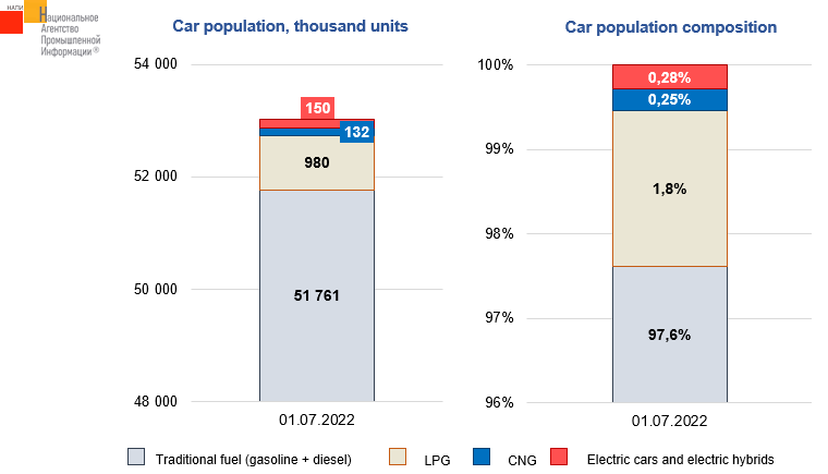 According to the NAPI data, as of July 1, 2022, the share of electric cars and electric hybrids in the car population* was only 0.28%, 150 thousand electric cars and electric hybrids travel on the roads of Russia. Compressed natural gas (methane) is used by 132 thousand cars, propane-butane (LPG) is used by 980 thousand cars. The bulk of cars (97.6%) runs on the traditional automotive fuel - gasoline or diesel.