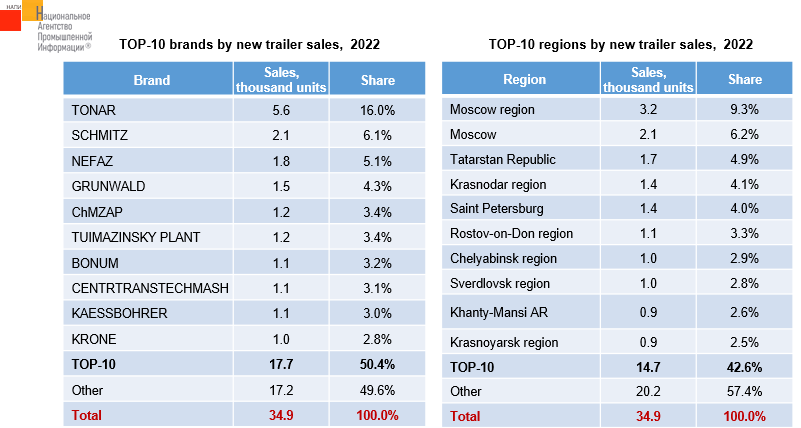 The Moscow region and the city of Moscow became the largest regional markets: these two regions accounted for 15.5% of new trailers sold. Following the last year results, TONAR became the leading brand by a large margin.