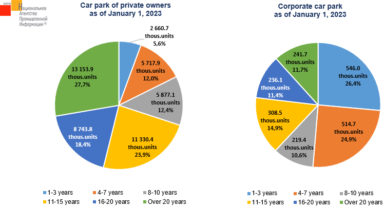 According to the marketing agency NAPI, as of January 1, 2023, the car park of private owners numbers 47.5 million units. Cars aged over 20 years account for 27.7% of the park, the second largest group includes cars aged 11-15 years (23.9%). Cars aged up to 7 years inclusive account for only 17.6% of the park. Corporate clients own 2.1 million cars. The age structure of the corporate park is different. The largest group includes cars aged under 3 years inclusive: they account for a little more than a quarter of the corporate park, while cars aged 4-7 years are on the second place. The total share of cars aged up to 7 years inclusive slightly exceeds half of the corporate park (51.3%).