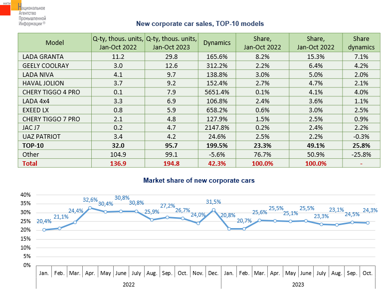 According to the marketing agency NAPI, over ten months of 2023, new corporate car sales increased by 42.3% and reached 194.8 thousand units. The share of corporate sales in the new car market was 24% following results of ten months. A year earlier, corporate clients accounted for 25.4% of the market.