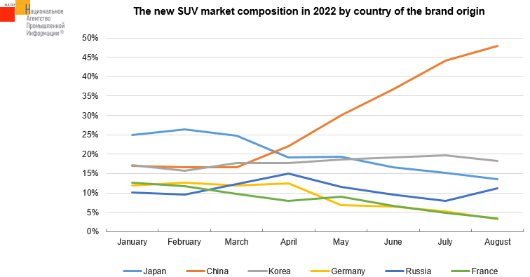 According to the data of NAPI (National Industrial Information Agency), the share of Chinese vehicles in the structure of sales of new vehicles of the SUV segment has sharply increased. If in January 2022 the share of Chinese vehicles was 17%, in August it grew to 48%. The share of Japanese vehicles, which were leaders in this segment in January – March, decreased from 25-26% to 13.5% in August.