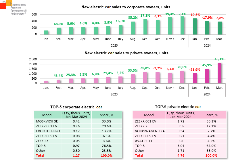 According to the marketing agency NAPI, in the period from January to March of the current year, new electric car sales to corporate owners were declining on the previous month. The peak demand for electric cars among corporate clients took place in December last year, when 0.5 thousand electric cars were sold. However, compared to Q I of last year, the corporate electric car market grew by 133.5%, 1.3 thousand corporate electric cars were sold. New electric car sales to private owners set a record in March 2024, when 2.2 thousand electric cars were sold. Following results of Q I 2024, sales increased by 300% and reached 4.8 thousand units.