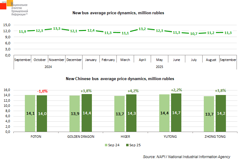 According to the marketing agency NAPI, the average price for new buses* decreased by 5.3% (from 11.9 million rubles to 11.3 million rubles) over the year, from September 2024 to September 2025. Over the month, from August to September of the current year, the price grew by 0.5%. Despite the year-over-year decline, average prices for a number of new Chinese buses increased. For example, the price for HIGER was up by 4.2%, ZHONG TONG and GOLDEN DRAGON - by 3.8%, and YUTONG - by 2.2%. Only FOTON saw a price decrease (-1%). Chinese buses appreciated by 322 thousand rubles on average: their price reached 573 thousand rubles.