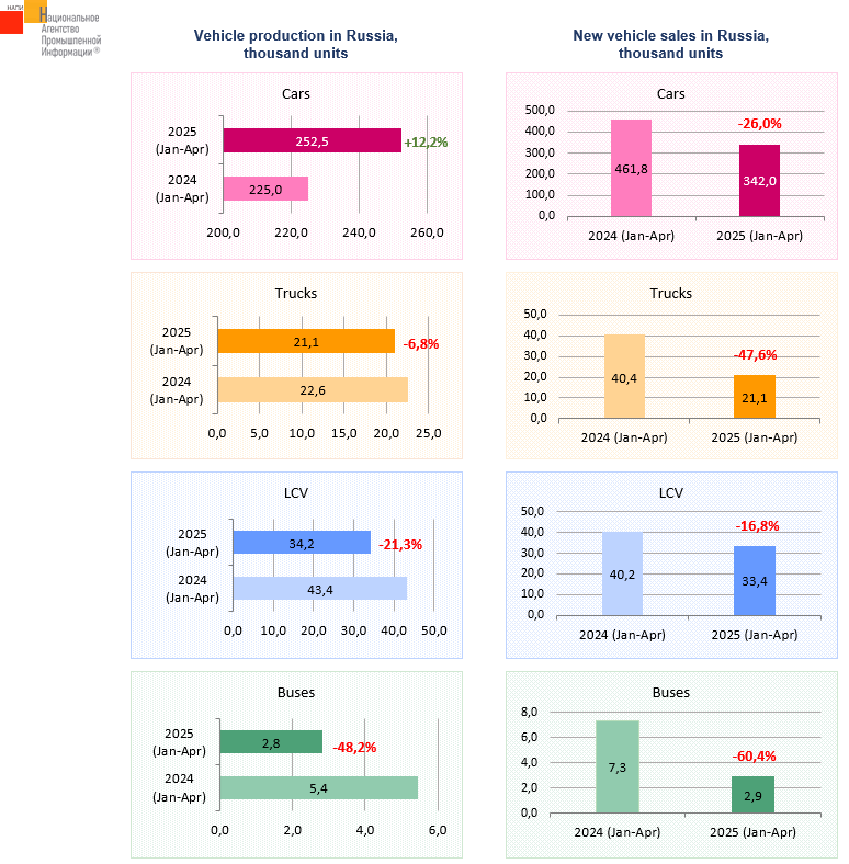 The marketing agency NAPI analyzed data on new vehicle production and sales in January-April 2025. In the period under review, only the car production increased, while that of commercial vehicles fell. The truck production decreased by only 6.8%, while the market fell by 47.6%. The bus production also did not decrease as much as the new vehicle sales. The LCV* production decreased more than the market.