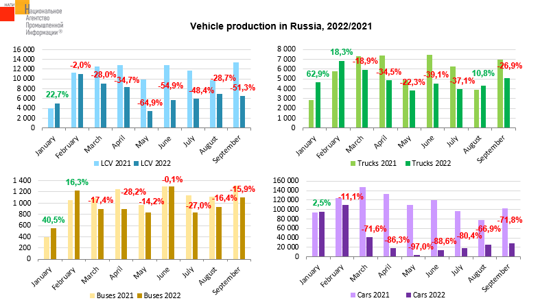 According to the data of NAPI (National Industrial Information Agency), 29.1 thousand cars were produced in September 2022 (against 102.9 thousand units in September 2021), 5.1 thousand trucks (7.0 thousand units in September 2021), 6.6 thousand light commercial vehicles (13.5 thousand units in September 2021), 1.1 thousand buses (1.3 thousand units in September 2021). Over 9 months of the current year, 355.8 thousand cars were produced (-64.5% on the same period of the last year), 44 thousand trucks (-16.8%), 62.3 thousand. light commercial vehicles (- 36.7%) and 8.6 thousand buses (- 10.9%).