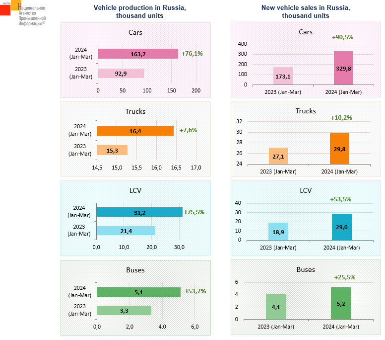The marketing agency NAPI analyzed data on the new vehicle production and sales in January-March 2024. The car production grew at the fastest rate (+76.1%), although market growth was even more impressive (+90.5%). The truck production grew the least (+7.6%), but the market was up by only 10.2%.