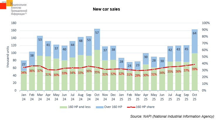The marketing agency NAPI analyzed the dynamics of new car sales by engine capacity. In January-October 2025, 1,045.5 thousand new cars were sold, which was a 19.1% decline on the similar period of 2024. Of them, 356.5 thousand units equipped with engines capacity of over 160 HP (-18.6% on 2024) and 688.9 thousand units with engines capacity of 160 HP or less (-19.3%) were sold.