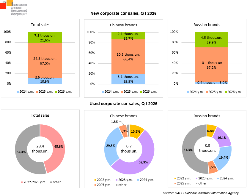 In the new car segment, 15.6 thousand Chinese cars (43.2% of all sales) and 15.1 thousand Russian cars (41.7%) were sold. More than 60% of cars sold, both those of Chinese and Russian brands, were manufactured in 2025. Cars manufactured in 2026 accounted for 13.7% of Chinese car sales and 29.9% of Russian car sales.