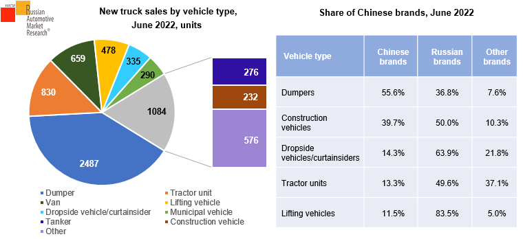 It is interesting to note that in June, Chinese brands took the first place in terms of supply of dumpers: they occupied 55.6% of the new dumper market. Chinese brands have achieved the best results in the segments of construction vehicles, dropside vehicles and curtainsiders, lifting vehicles, and tractor units.