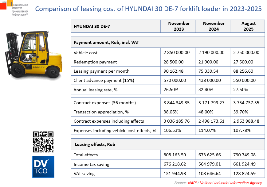 The marketing agency NAPI analyzed the leasing cost of HYUNDAI 30 DE-7 forklift loader in November 2023, November 2024 and August 2025 using the online DV – TCO total cost of ownership calculator.