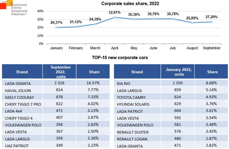 According to the data of NAPI (National Industrial Information Agency), over the first nine months of 2022, corporate clients purchased 124.8 thousand new cars, the share of corporate sales in the new car market reached 25.2%. It should be noted that in the period from April to July, the share of corporate clients was even higher and exceeded 30%. In September, the TOP-10 new corporate cars included only VOLKSWAGEN POLO in addition to Russian and Chinese cars.