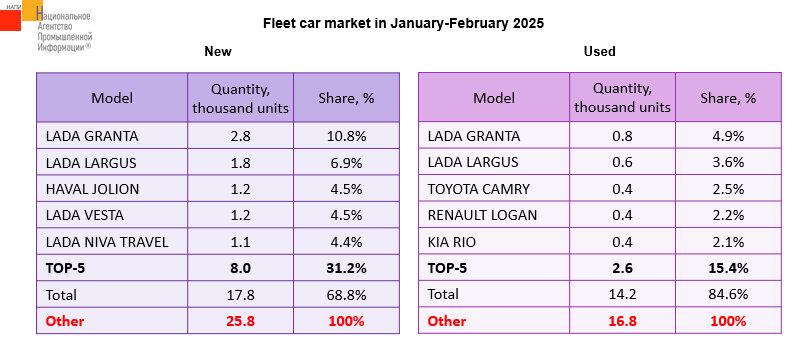 The marketing agency NAPI analyzed car fleet sales in January-February 2025. It is interesting to note, that compared to last year, sales of used cars to corporate clients increased by 2.8%, but the demand for new cars fell by 25.6%. LADA GRANTA and LADA LARGUS were in the greatest demand among new and used cars among corporate clients. The most popular foreign car in the new car market was HAVAL JOLION, in the used market - TOYOTA CAMRY.
