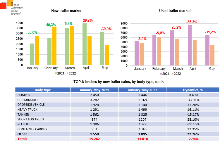 According to NAPI/Russian Automotive Market Research, despite the decline in new trailer sales over the first five months of 2022, demand for dropside trailers, as well as short log trucks, heavy trucks and container carriers has increased. The used trailer and semi-trailer market fell by 22.6% over the first five months of 2022: 26.6 thousand used trailers were sold against 34.4 thousand units sold over the first five months of the last year.