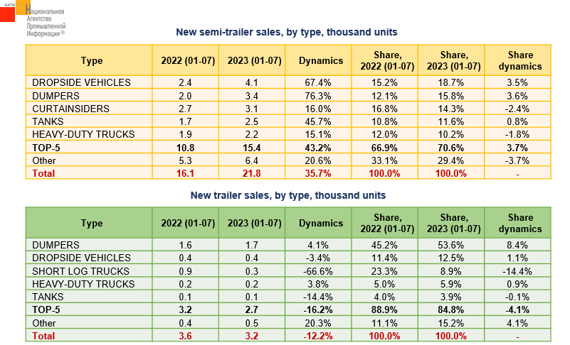 According to the marketing agency NAPI, over 7 months of 2023, new semi-trailer sales increased by 35.7%, while sales of new trailers fell by 12.2%. In the new semi-trailer market, the demand for dropside vehicles, dumpers, and tanks grew at a faster pace. In the trailer market, only dumpers and heavy-duty trucks showed sales growth, sales of other types of trailers included in TOP-5 decreased, especially the segment of short log trucks suffered significantly (-66.6%).