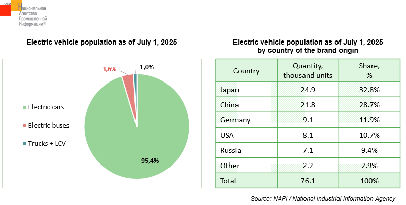 According to the marketing agency NAPI, the electric vehicle population* numbered 76,800 units as of July 1, 2025. The vast majority (95.4%) are electric cars, while electric buses account for 3.6% of the population. 85% of all electric buses operate in Moscow, with Russian vehicles accounting for 98.6% of the electric bus population.