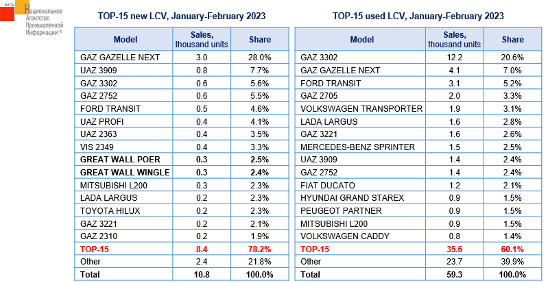 According to the marketing agency NAPI, used LCV sales (vehicles with GVW of up to 6 tons) grew by 8.6% over the first two months of 2023: in January-February 2023, 59.3 thousand used vehicles were sold against 54.6 thousand units in the previous year.