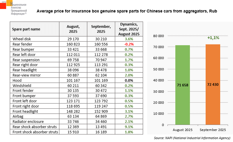 The marketing agency NAPI analyzed insurance box genuine spare parts’ prices for Chinese cars from aggregators. Over the month, from August to September 2025, the average price increased by 1.1% to 72.4 thousand rubles.