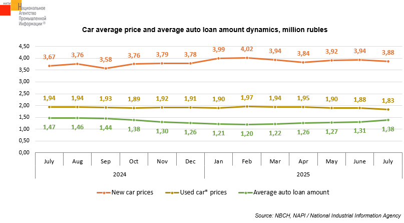 The marketing agency NAPI analyzed the dynamics of average prices for cars, as well as the dynamics of average auto loan amount. Thus, in July 2025, the average new car price reached 3.88 million rubles, which was a 5.7% rise on the last year's price. The used car* cost, on the contrary, decreased by 5.8% to 1.83 million rubles. According to the NBCH, in July of the current year, the average auto loan amounted to 1.38 million rubles, having decreased by 6.4% on the similar period of the last year.