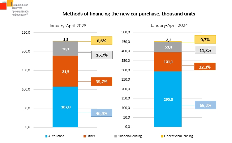 The marketing agency NAPI analyzed ways to finance the purchase of new cars. Auto loan remains the most popular method. Following results of four months of 2024, the share of cars purchased using the auto loan increased to 65.2%. 11.8% of cars were purchased under financial leasing and 0.7% - under operational leasing.