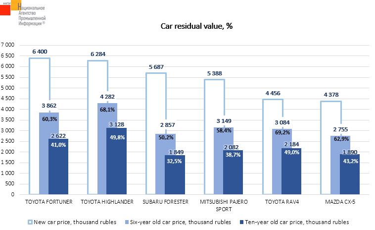 The marketing agency NAPI (National Industrial Information Agency) updated the "Car residual value" report based on the results of Q II 2025. Among six-year-old and ten-year-old Japanese cars presented in the graph, TOYOTA HIGHLANDER could be sold at the highest price in Q II 2025: its average price was 4,282,000 rubles and 3,128,000 rubles, respectively. TOYOTA RAV4 became the leader by residual value preservation in relation to the new car price in Q II 2025 after 6 years of operation. Thus, having sold a six-year-old car, the owner could buy a new TOYOTA RAV4, paying additionally 30.8% of its price in Q II 2025. After 10 years, TOYOTA HIGHLANDER was the leader by residual value preservation in relation to the new car price in Q II 2025. Having sold a ten-year-old car, the owner could purchase a new TOYOTA HIGHLANDER, paying additionally only 50.2% of its price in Q II 2025.
