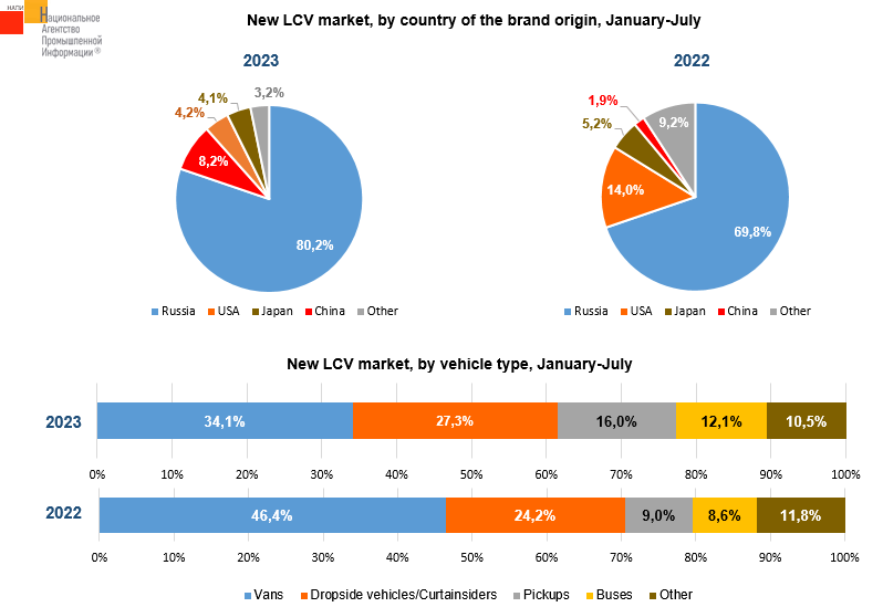 The marketing agency NAPI analyzed data on light commercial vehicle sales for 7 months of 2023. The share of pickups in the new LCV market increased significantly (by 7%) due to the rapid growth in sales of Chinese vehicles. Chinese automakers are not actively developing other segments of the LCV market yet. Due to the departure of Ford Transit, a popular light commercial vehicle in the market, and European brands, the share of Russian vehicles grew to 80.2% over the year.