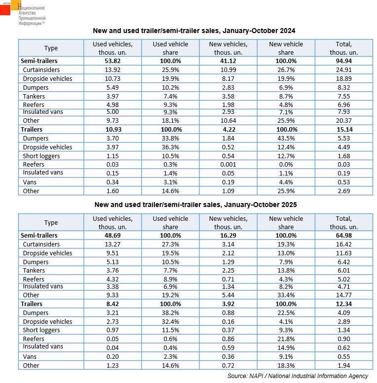 Also, in January-October of the current year, 3.92 thousand new trailers (-7% on January-October 2024) and 8.42 thousand used trailers (-23%) were sold. Among new vehicles, sales of dropside trailers (-69.2%) and dump (-51.9%) trailers more than halved. At the same time, sales of new reefers, vans, and insulated vans increased. Among used vehicles, sales of insulated vans declined the most (-75.7%). Sales of used reefers increased.