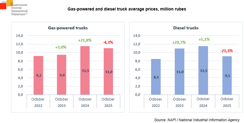 The marketing agency NAPI analyzed the dynamics of average prices for new gas-powered and diesel trucks*. Diesel truck prices increased the most in 2023, rising by 29.7% in October. Gas-powered truck prices grew by 21.8% in October a year later. Meanwhile, diesel truck prices were up by only 5.1% in October 2024. Truck prices fell in October 2025: gas-powered trucks depreciated by 4.3% to 11 million rubles, while diesel trucks - by 21.3% to 9.1 million rubles.