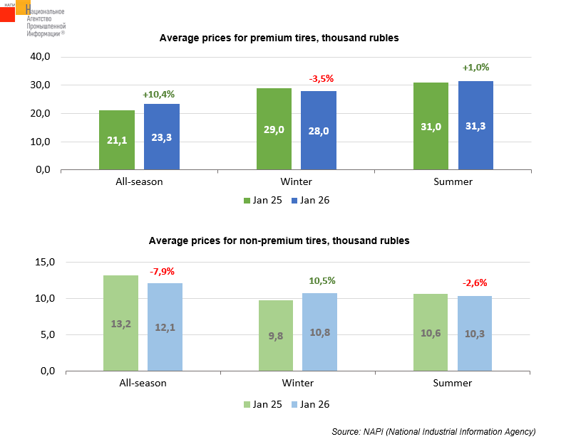 Over the year, from January 2025 to January 2026, premium all-season tires appreciated by 10.4% to 23.3 thousand rubles, while the price for non-premium tires fell by 7.9% to 12.1 thousand rubles.