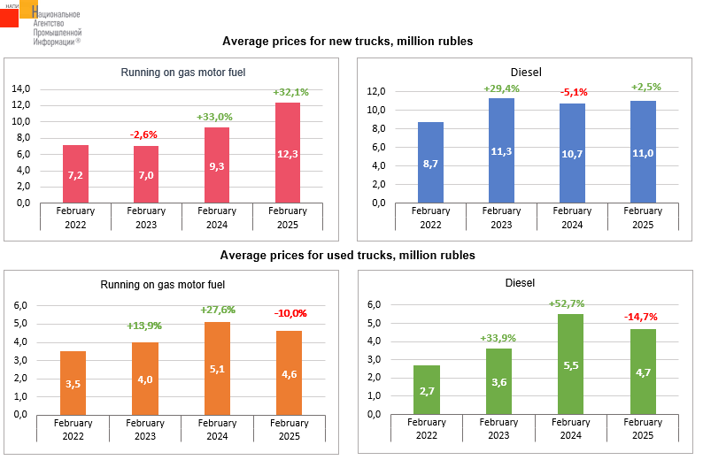 The marketing agency NAPI analyzed the dynamics of average prices for diesel trucks and vehicles running on gas motor fuel. Compared to February 2022, the price for used diesel trucks have increased the most (+74.0%), followed by new trucks running on gas motor fuel (+70.8%). The price for used trucks running on gas motor fuel have grown by 31.4%, while that for new diesel trucks – by 26.4%.