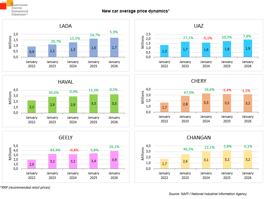 The marketing agency NAPI analyzed the dynamics of average prices* for new cars in January 2022-2026. The analysis focused on such Russian brands as LADA and UAZ, as well as the best-selling Chinese brands in 2025: CHANGAN, CHERY, GEELY, and HAVAL.