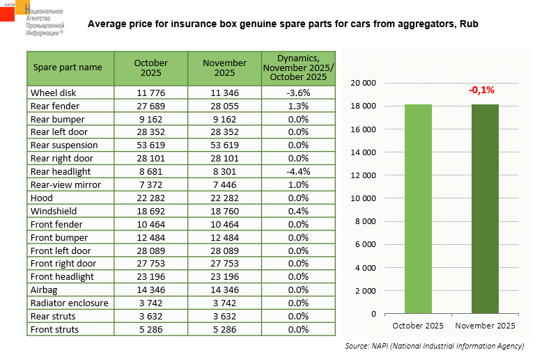 The marketing agency NAPI analyzed insurance box genuine spare parts’ prices for Russian LADA and UAZ cars from aggregators. Over the month, from October to November 2025, the average price for genuine spare parts decreased by 0.1%. Specifically, the price for rear headlights (-4.4%) and wheel disks (-3.6%) fell. Meanwhile, the price for rear fender (+1.3%), rear-view mirror (+1%), and windshield (+0.4%) grew.