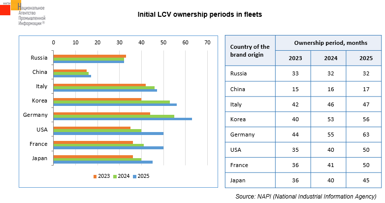 In 2025, the initial ownership periods for LCV of all countries of origin included in the table increased compared to 2024. Corporate clients operated LCV of Italian (47 months), French (50 months), German (63 months), American (50 months), Korean (56 months), and Japanese (45 months) brands the longest.
