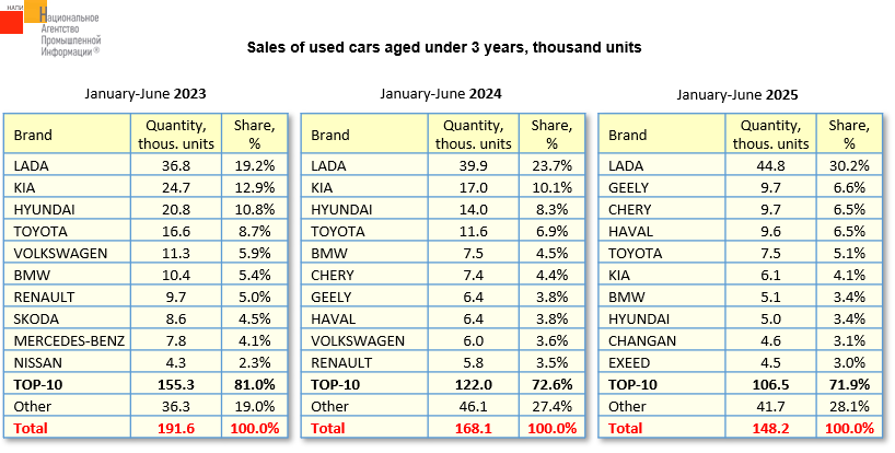 The marketing agency NAPI compared sales of used cars aged under three years in the first half of 2025, 2024 and 2023. In the first half of 2023, no Chinese brand entered TOP-10. In January-June 2024, three Chinese brands entered TOP-10 "fresh" used cars - CHERY, GEELY and HAVAL. In the first half of the current year, half of TOP-10 brands were Chinese. Deliveries of new and used European, Japanese, Korean cars aged under three years have significantly decreased in recent years, while Chinese automakers, on the contrary, have expanded their presence in the Russian market, which led to a similar composition of the "fresh" used car market.