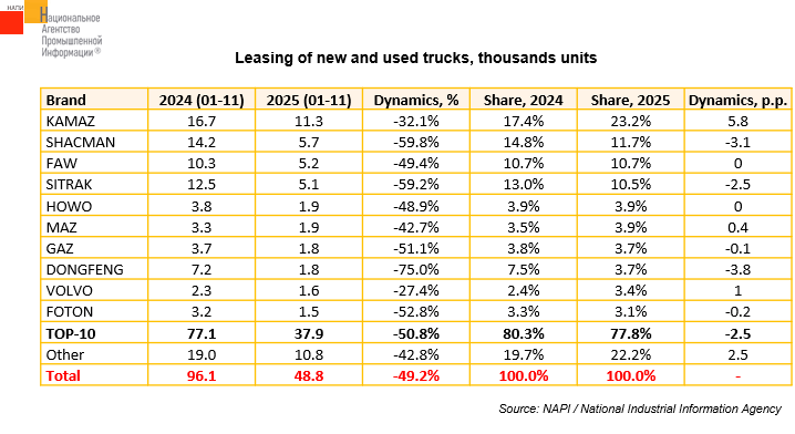 It should be noted that KAMAZ remains the most leased brand, with 11.2 thousand trucks sold over the first 11 months of the current year, accounting for 23.2% of the total volume of trucks leased. Over the year, KAMAZ's share grew by 5.8 p.p.