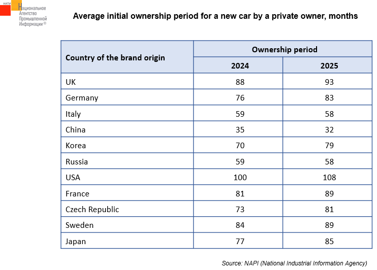 Meanwhile, ownership periods for Italian (-1 month), Russian (-1 month), and Chinese (-3 months) cars decreased; in 2025, they were significantly shorter than those for other brands. Initial ownership periods made 58 months for Italian and Russian cars, while only 32 months for Chinese cars.