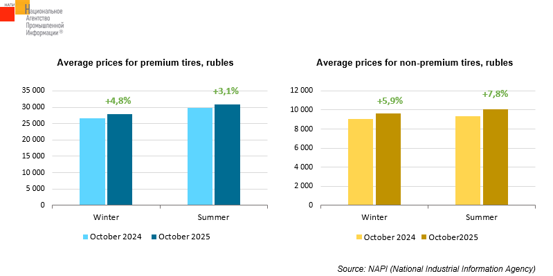 Over the year, from October 2024 to October 2025, the average price for premium winter tires increased by 4.8%, while that for summer tires - by 3.1%. Non-premium winter tires appreciated by 5.9%, while summer tires - by 7.8%.