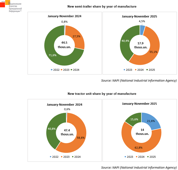 As for sales of new tractor units, it can be noted that, based on the results of the first 11 months of 2024, the share of vehicles of the same year of manufacture was 40.8%, while in 2025 it fell to 15.6%. It should also be noted that import and production of tractor units decreased this year, as 2024 and 2023 stocks are putting pressure on the market. In January-November 2025, vehicles produced last year accounted for 62.8% of sales and tractor units produced in 2023 - 21.6%. Over the similar period of 2024, the share of sales of vehicles produced last year was slightly lower (58.6%).