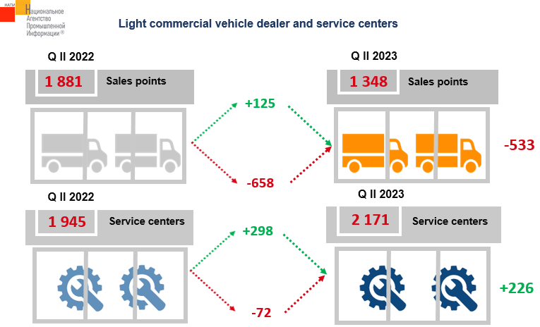 The marketing agency NAPI has updated the report on light commercial vehicles dealers. In Q II 2023 there are 1,348 light commercial vehicle sales centers and 2,171 service centers. Compared to Q II last year, the number of sales points decreased by 533 units due to the departed brands. At the same time, JAC has increased the number of its sales centers (+46 centers), dealerships for sales of SOLLERS Atlant and Argo vehicles have been opened. The service network has expanded primarily due to SOLLERS, KAMAZ Compass 5 and JACK.