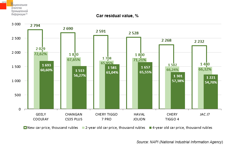Geely Coolray became the leader by residual value preservation relative to the new car price after two years of operation. Having sold a two-year-old car, the owner could purchase a new Geely Coolray additionally paying 27.38% of its price in Q IV 2025. After four years of operation, Haval Jolion was the leader by residual value preservation relative to the new car price. Having sold a four-year-old car, the owner could purchase a new Haval Jolion additionally paying 34.45% of its price in the previous quarter.