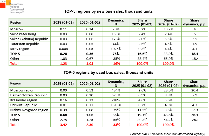 New bus sales grew in all regions included in TOP-5 in 2026. Moscow topped the list, with 0.14 thousand buses sold over the two months, accounting for 13.2%. TOP-5 regions accounted for more than a third of new bus sales (0.36 thousand units): their share grew by 18.4 p.p. year-on-year.