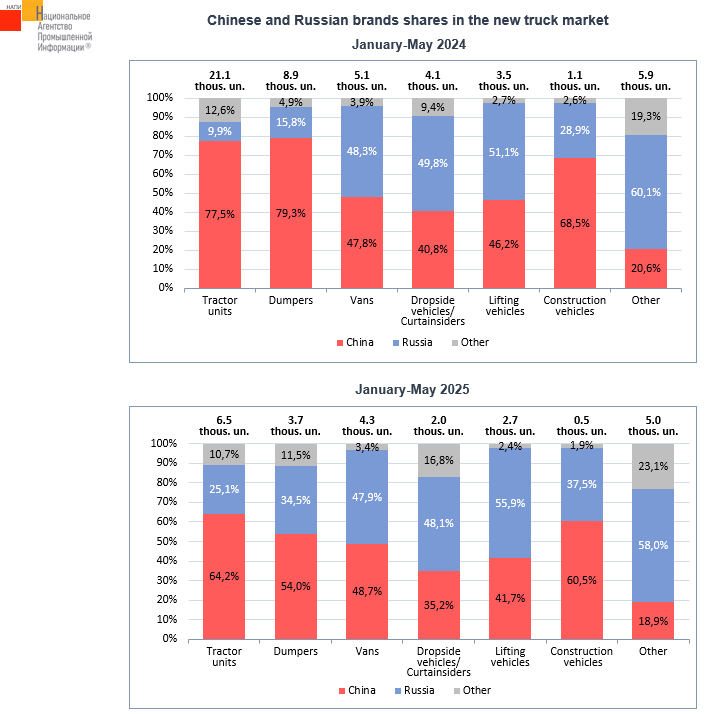 According to the marketing agency NAPI, sales of new Chinese trucks fell by 63.4% in January-May of the current year, while the entire market declined by 50.1%. As a result, the share of Chinese vehicles on the market was down from 62.6% to 45.9% over the year. The share of Chinese brands fell the most in the segments of dumpers (-25.3 p.p.), tractor units (-13.3 p.p.) and construction vehicles (-8 p.p.). The only segment where the share of Chinese trucks grew slightly was vans (+0.9 p.p.).