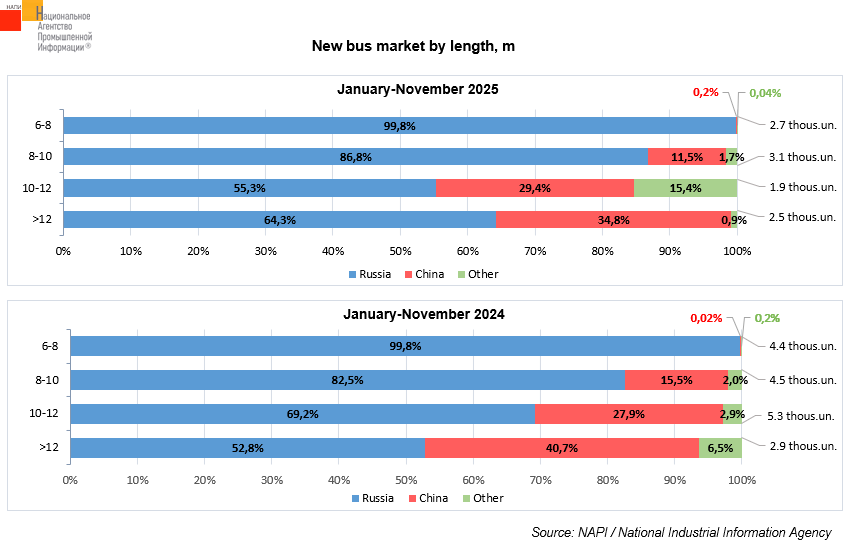 Over the year, the share of Russian brand vehicles grew in sales of 8-10 m (+4.3 p.p.) and over 12 m (+11.5 p.p.) buses, but decreased in sales of 10-12 m buses (-13.9 p.p.). The share of Chinese brand vehicles increased in sales of 6-8 m (+0.2 p.p.) and 10-12 m (+1.5 p.p.) buses, but decreased in sales of 8-10 m (-4 p.p.) and over 12 m (-5.9 p.p.) buses.