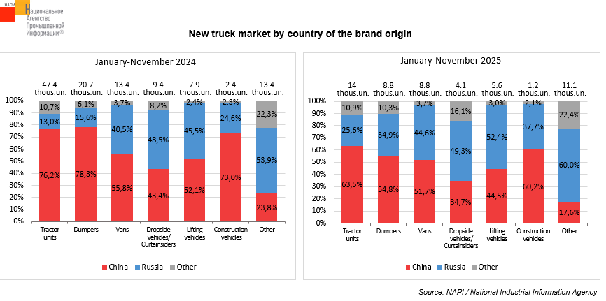 Sales of new Russian trucks decreased by 26.5% year-on-year to 22.6 thousand units, while those of Chinese ones fell by 65.9% to 24.9 thousand units. Over the year, the share of new Russian trucks grew by 15.4 p.p. to 42.2%, while that of Chinese ones decreased by 17.3 p.p. to 46.4%. The share of Russian trucks increased the most in the dumper (+19.3 p.p.) and tractor unit (+12.6 p.p.) segments. At the same time, the share of Chinese vehicles decreased in all segments, with the sharpest decline in the tractor unit segment (-23.5 p.p.).