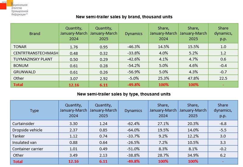 According to the marketing agency NAPI, sales of new semi-trailers in the first quarter of 2025 fell by 49.8%. TONAR remained the best-selling brand: it increased its share to 15.5%. In the first quarter of last year, TOP-5 included KRONE and SCHMITZ, but this year they occupy only the tenth and fifteenth lines in the ranking, respectively.