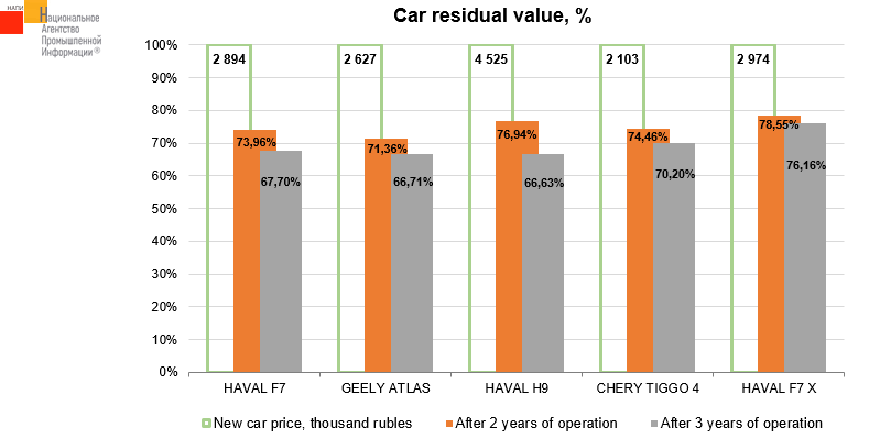 The marketing agency NAPI updated the «Car residual value» report for Q III 2022. HAVAL F7 X became the leader by residual value preservation among the best-selling Chinese cars shown on the chart after 2 and 3 years of operation: it retained 78.55% and 76.16% of the new car value.