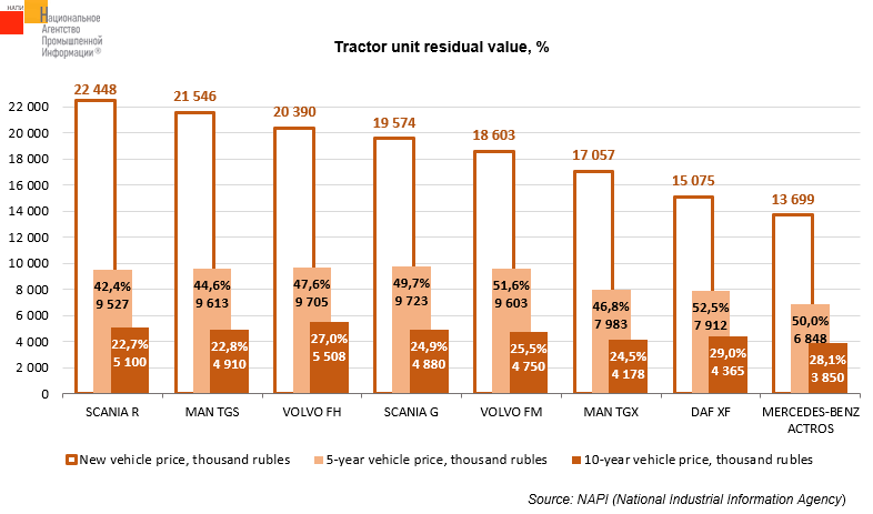 Among five-year-old tractor units shown in the graph, SCANIA G could be sold at the highest price last quarter: its average price was 9.7 million rubles. Among ten-year-old tractor units , VOLVO FH was offered at the highest price: 6.5 million rubles.