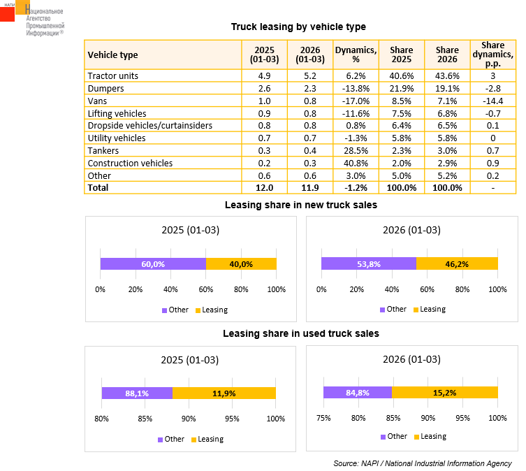 According to the marketing agency NAPI, 11.9 thousand new and used trucks* were issued to corporate clients under financial leasing in January-March 2026, which was a 1.2% decline on the similar period of 2025.
